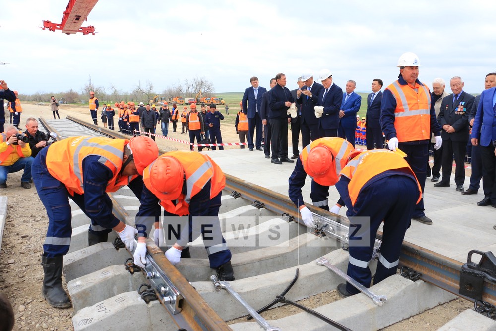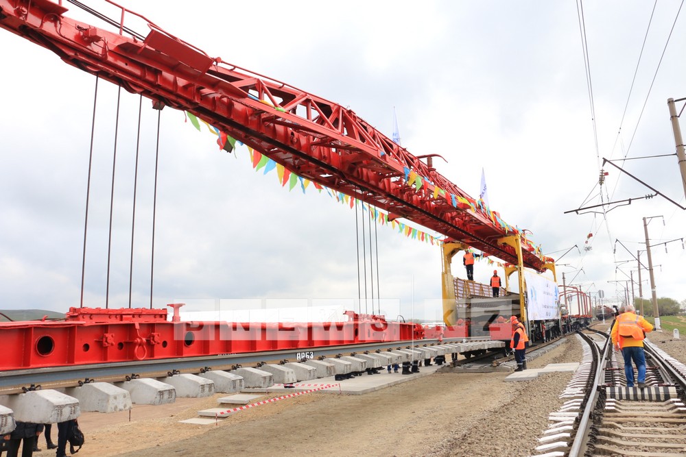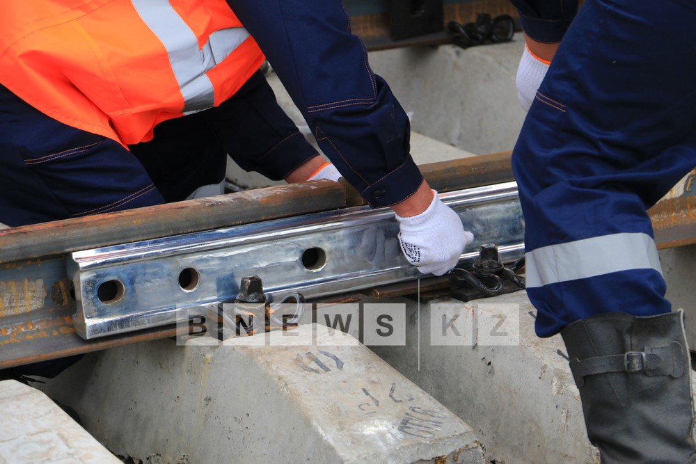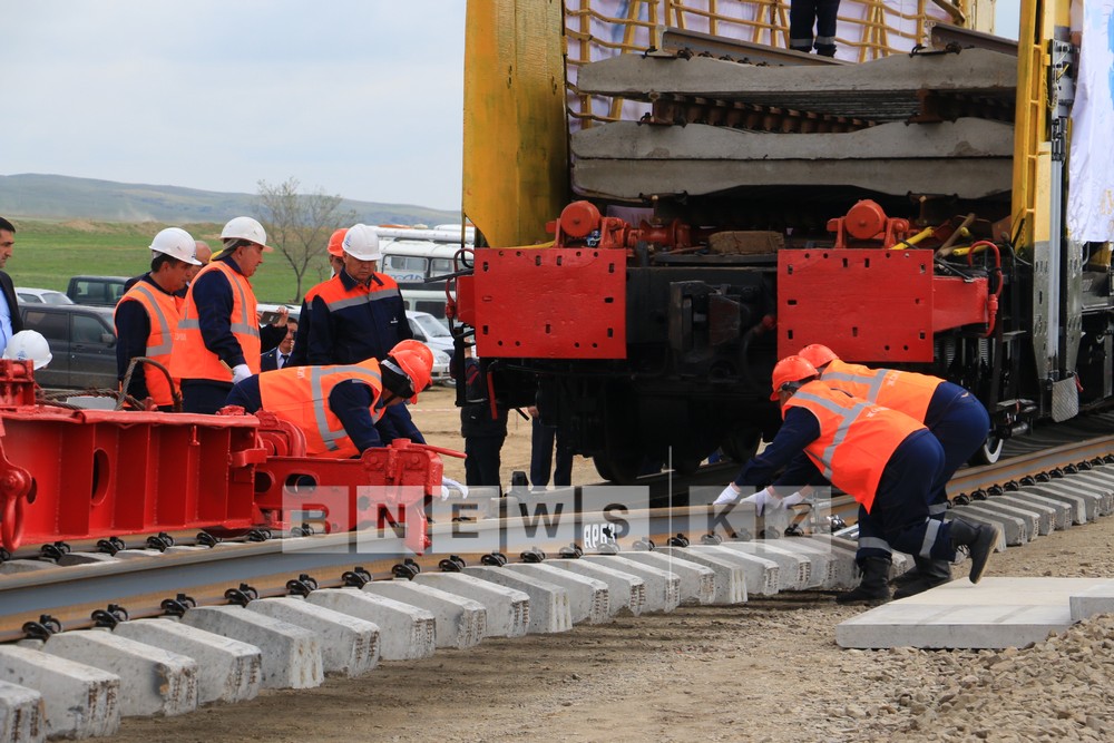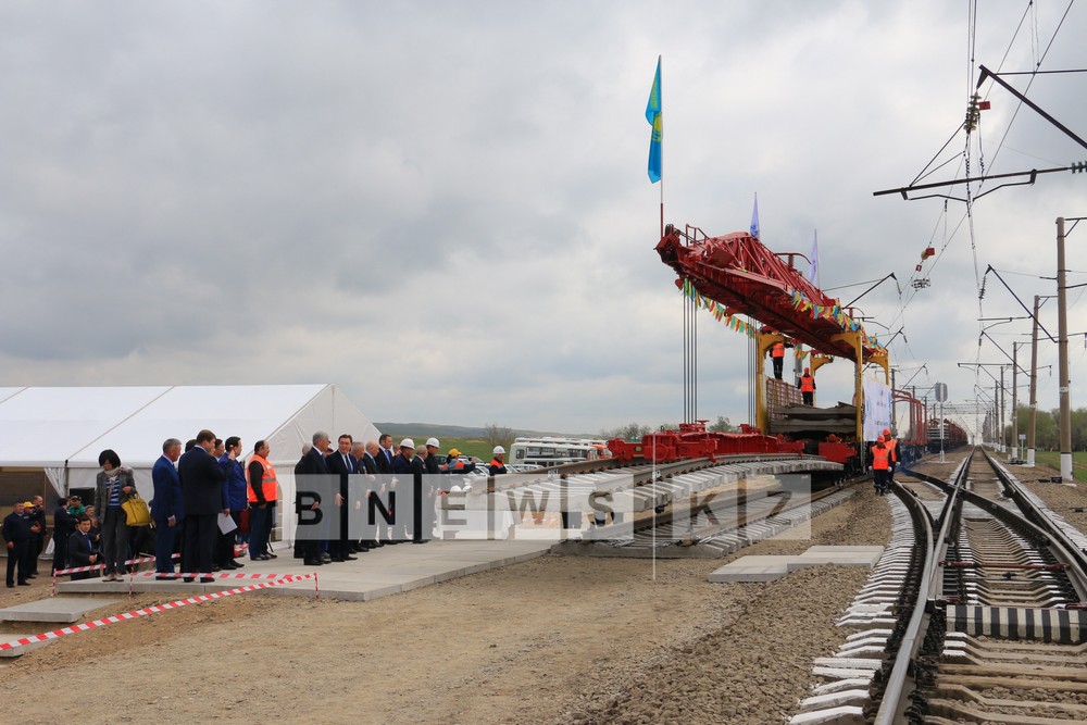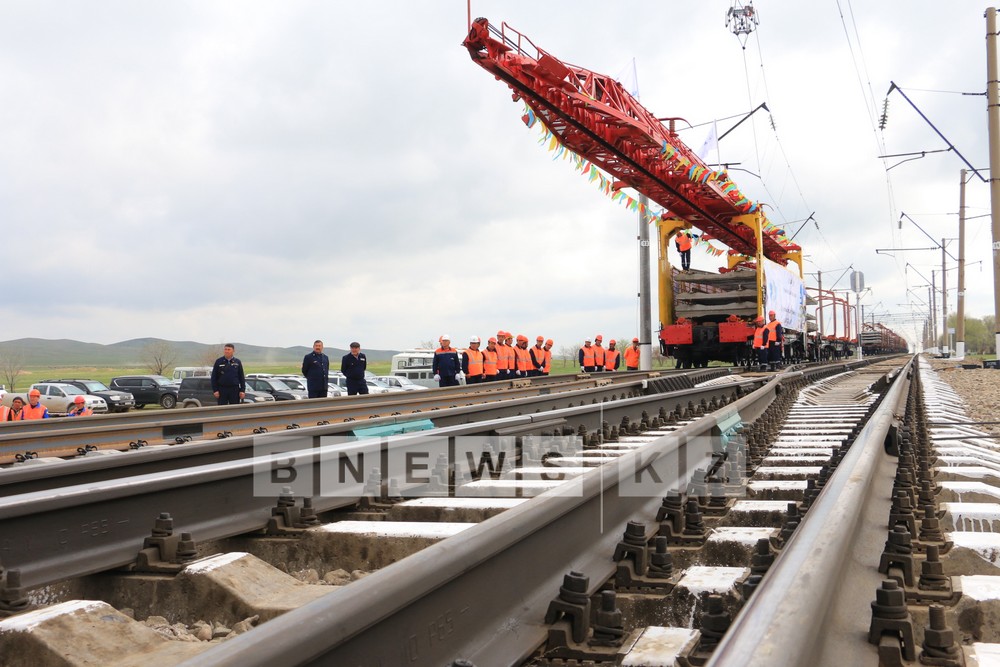 Today, first section of assembled rails and sleepers which was produced domestically on Aktobe Rail and Section Works has been laid on the segment of opposite directed branch line from Almaty to Shu which is under construction.