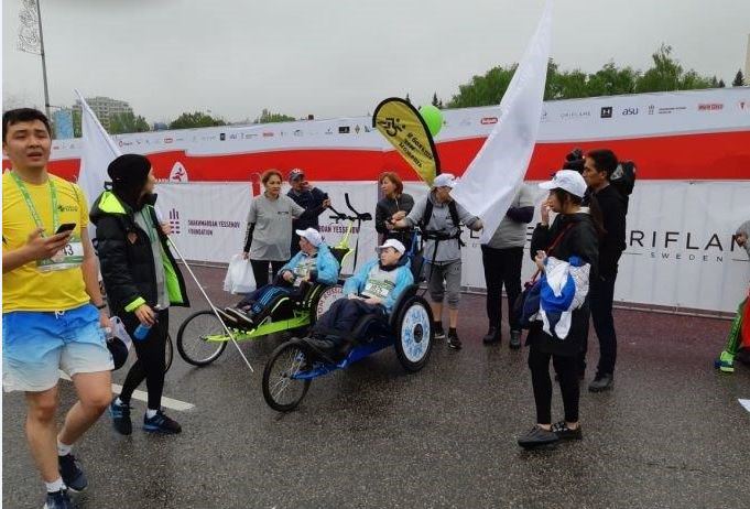 Участвовали в Алматы марафоне наравне с простыми бегунами всех возрастов от мала до велика, спортсмены с ограниченными возможностями, преодолевшие 10 км на колясках, это воспитанники реабилитационного центра «Мейiрiм», члены сообщества «АРДИ» и представители Национального паралимпийского комитета.